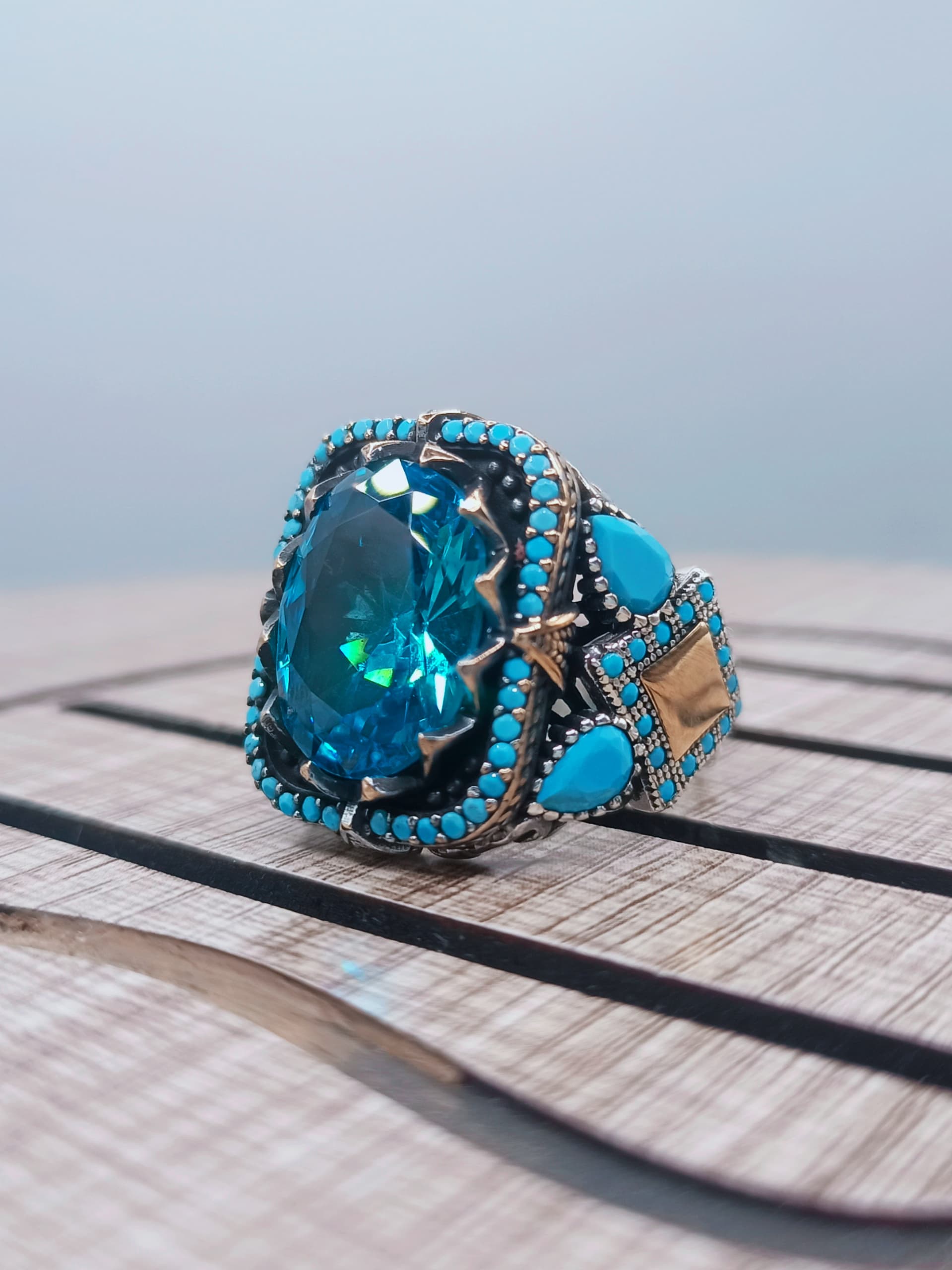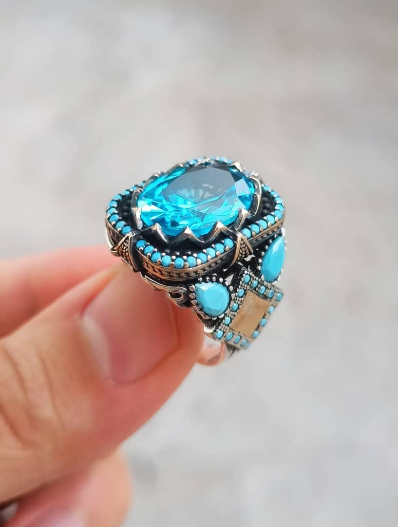 خاتم رجالي فخم – بريق فضة ونقاء لون الأزرق الأكوامارين